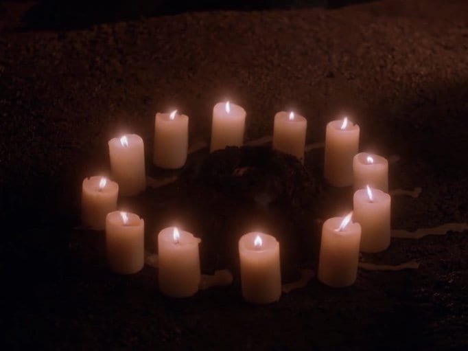The scene plays backwards. As MIKE is speaking “Fire walk with me” he’s extinguishing the eleven lit candles that form a circle in front of him, one by one. By doing so, one might say that he’s putting out the fire that his once familiar, now enemy BOB represents.