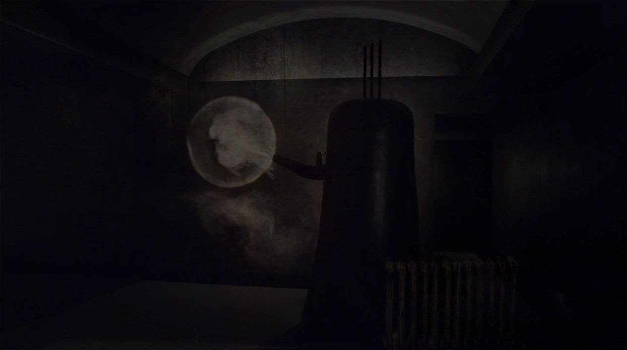 3. The bosomy woman appears from the other side of the building, telling Mr C in a backwards voice that she’ll unlock the door for him.