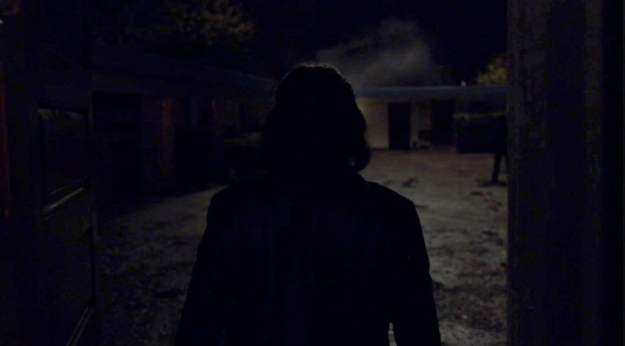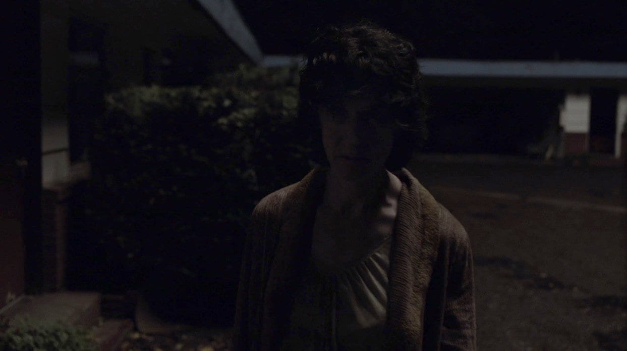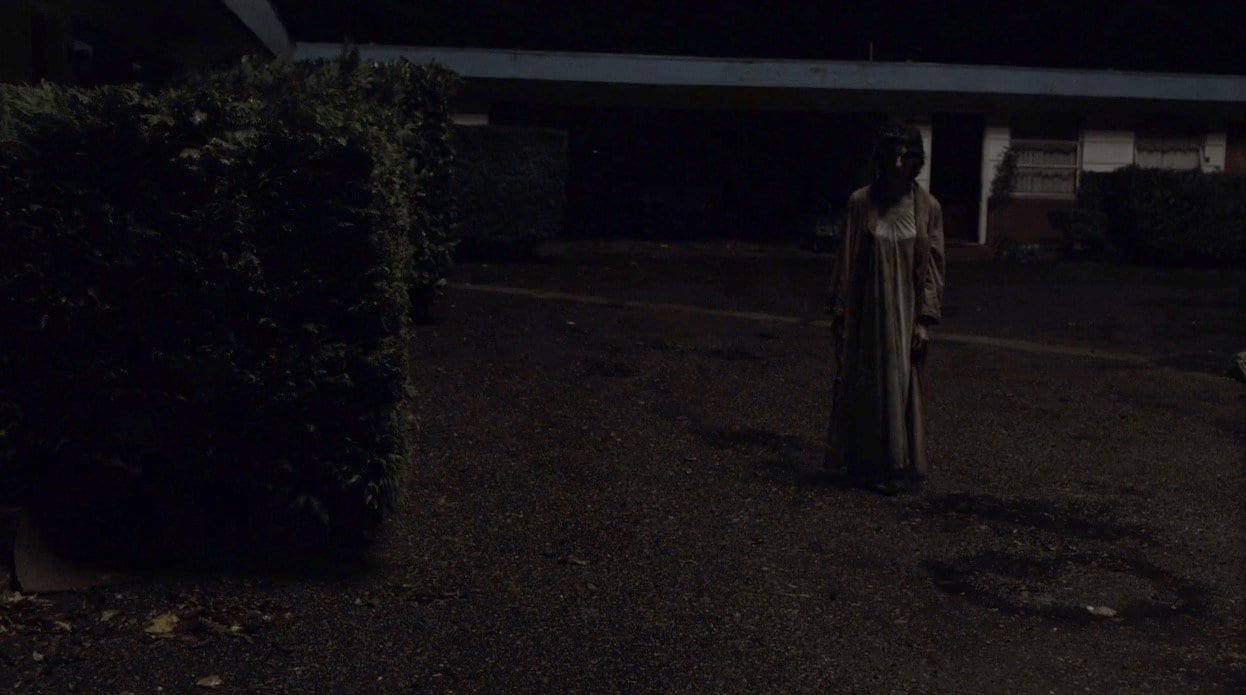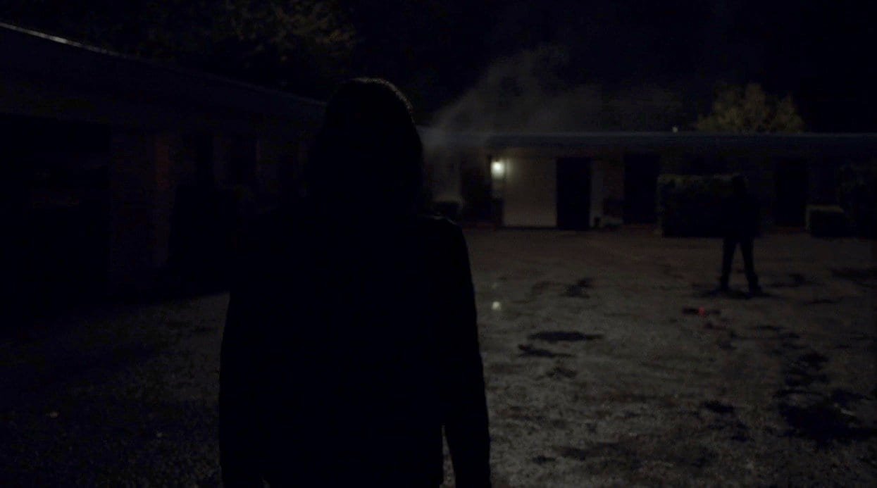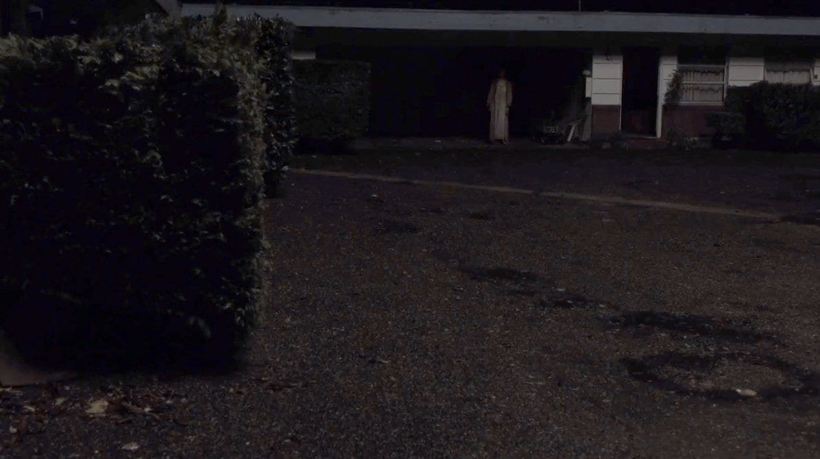 6. The Grandson (Pierre Tremond) jumps out from behind the corner just behind Leland. Wearing his mask (that is similar to The Jumping Man’s) he jumps around on the asphalt as Leland looks over his shoulder to see what’s going on. Teresa joins the girls in the motel room.