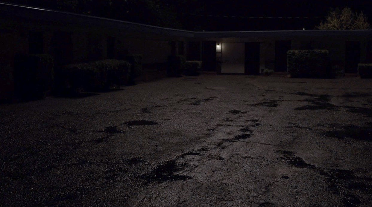 5. Teresa looks surprised as Leland quickly leaves the motel by walking over the courtyard/parking lot.