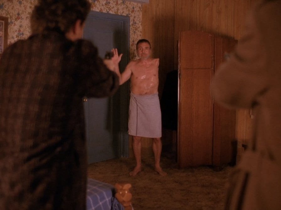 Catherine and Ben are in room 102 plotting to burn down the sawmill as well as having a romantic rendezvous. Catherine finds Ben’s chip from One-Eyed Jack’s and it will lead to her learning that Ben is the owner of the said establishment. Meanwhile, Josie is stalking Ben and Catherine from her car outside, taking pictures to collect proof of their conspiracy. At the same time a third party is joining in as Cooper, Andy and Hawk arrive to have a talk with the One-Armed Man. When they find him in room 101, however, it turns out that he’s not quite the mysterious character that Cooper saw in his dream, but a Philip Gerard, a surprised shoe salesman.
