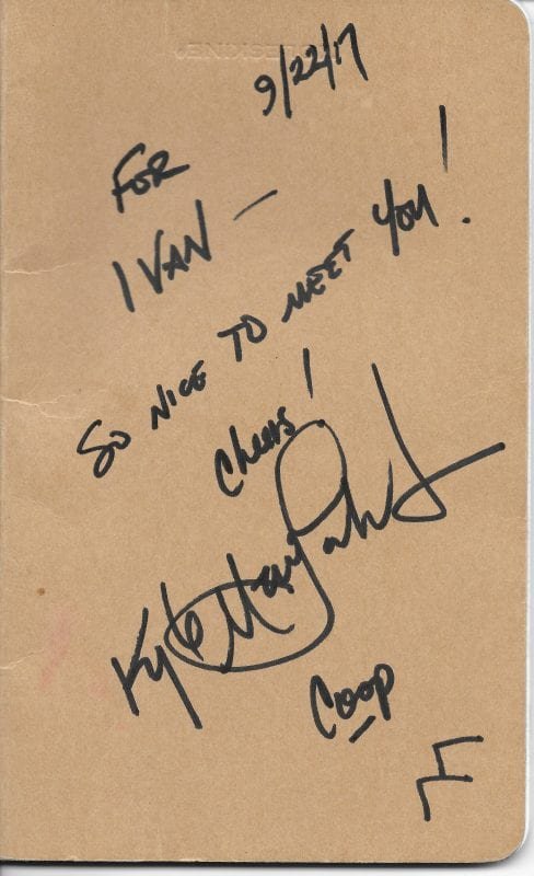 My impression of Kyle was that he was unfailingly kind, gracious, generous, and humble, without the ego, pretense, and fakery that often mar Hollywood celebrities. He took the time to listen to every fan, and respond thoughtfully, and without a rush. (Normally, at these kinds of events, you will have an assistant “gently” reminding you to hurry up because other people are waiting, but not in this case.) I am extremely grateful that I had the chance to meet Kyle and tell him how much his work has meant to me over the course of my entire life. These kinds of opportunities are rare, and I feel lucky to have had one. Kyle stands as an antidote to the pervasive Hollywood culture, and it is a thrill to learn that an artist you admire is also a human being worth the admiration.
