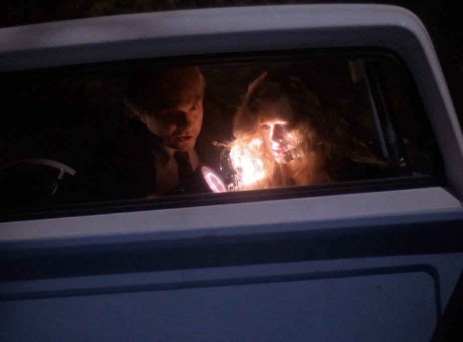 It’s a perfect example of male bonding to the sound of the burning logs, until the sound of the owl announces a bright light beyond the trees. And then, Major Briggs is gone. Left behind is a confused Cooper standing by the fire with the half-eaten fish still on the plates.