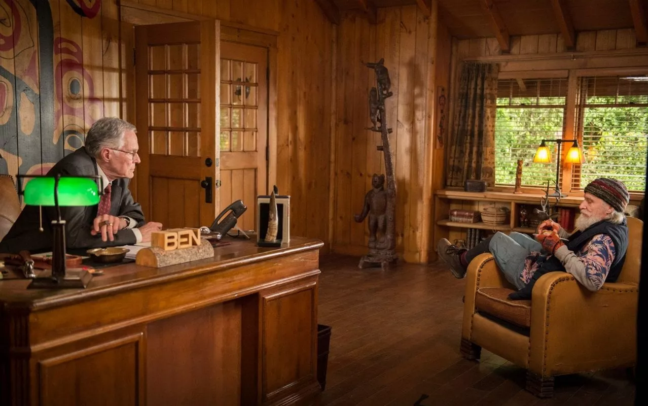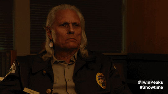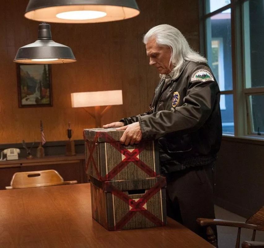 I think the most poignant moments of these two hours are in the scenes that are set in Twin Peaks. Lucy at her desk, looking remarkably unchanged by the passage of time; stalwart Andy in the wood-panelled conference room; Shelly in the Roadhouse (yes, even with strangers, and yes, even though she thinks James has always been cool…); the warmth of the sun as it filters through the — what kind of fantastic trees, again? — oh right! The Douglas firs outside Dr. Jacoby’s trailer; even Ben and Jerry discussing the benefits of edibles and, hilariously, their mother’s crocheted hat even has the warm glow of nostalgia about it. But it should be no surprise that the scenes that got me (and most of us) were the ones with Hawk and Margaret. Margaret’s log has something to tell Hawk, something about missing items (Agent Cooper? the diary page? Laura Palmer herself?) and his heritage (the Nez Perce symbol on the bathroom stall door? The Indian head coin?). But most interestingly, to me at least, is what she tells him in Part 2. “The stars turn and a time presents itself” she says. It’s a spine-tingling pronouncement, coming from the seer of seers in this mystical corner of the world.