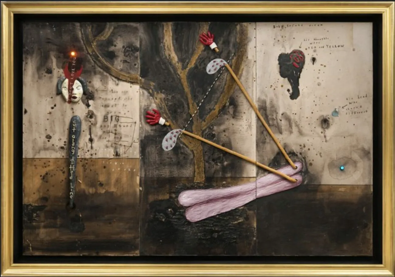 Most of the low-relief paintings in Lynch’s 2019 exhibition “Squeaky Flies in the Mud” (two more shit images) look like they’re smeared with it. “But, this texture and color scheme doesn’t gesture to some inner American darkness or a critique of its vacuity,” writes Colucci. “Instead, you get the sense that Lynch finds this earthy tactility utterly beautiful.” We can recall one of Lynch’s first memories as explored in his autobiography, Room to Dream: